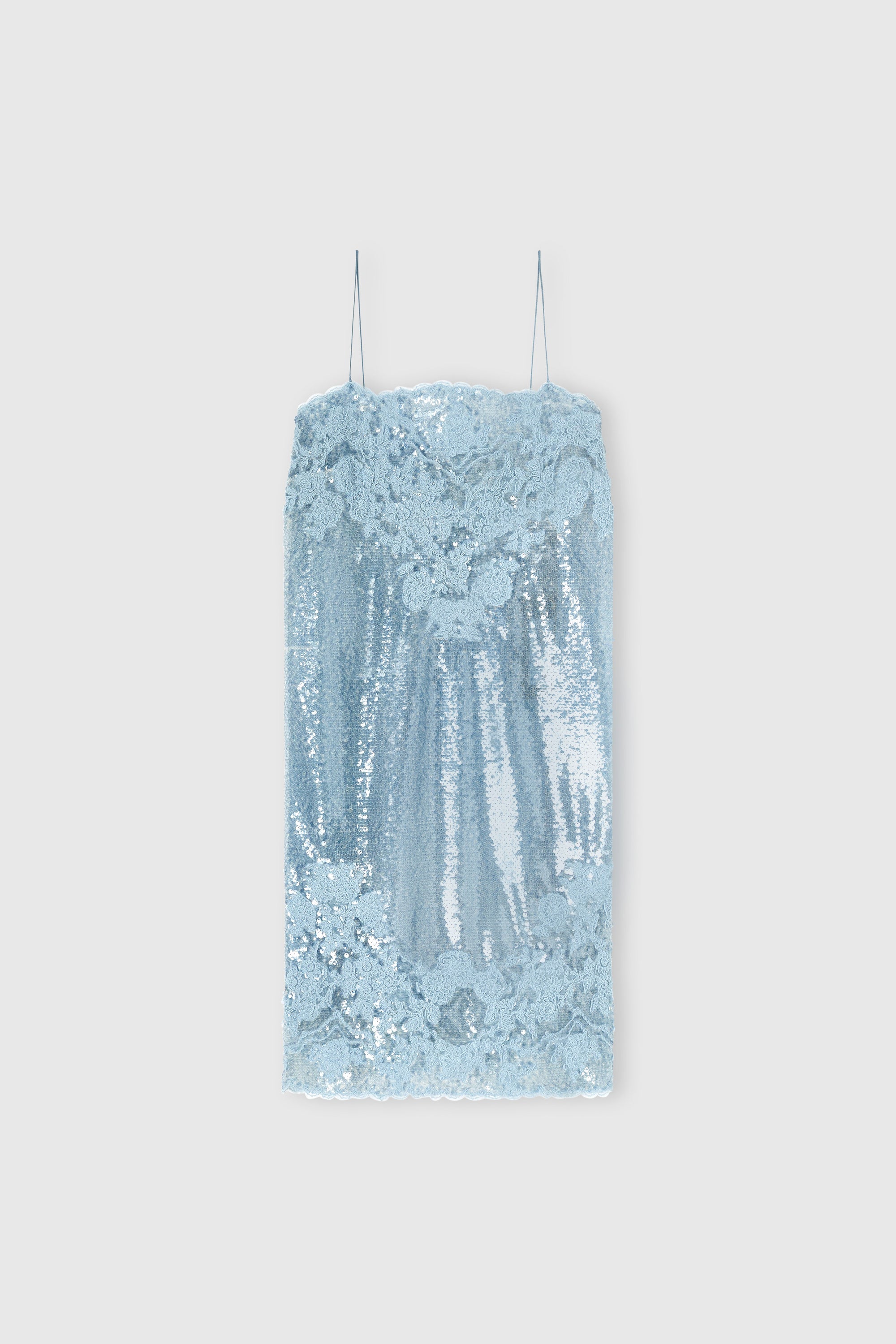 Radiant and seductive, this lingerie-style dress captures attention with its full sequin coverage, creating a striking wet-effect finish. Tone-on-tone rebrodé lace, hand-applied both at the straight neckline and hem, enriches the piece with movement and a delicate gradient effect, adding unique light reflections as the fabric flows. Perfect for sophisticated, sparkling evening looks, it embodies elegance and femininity in every detail.