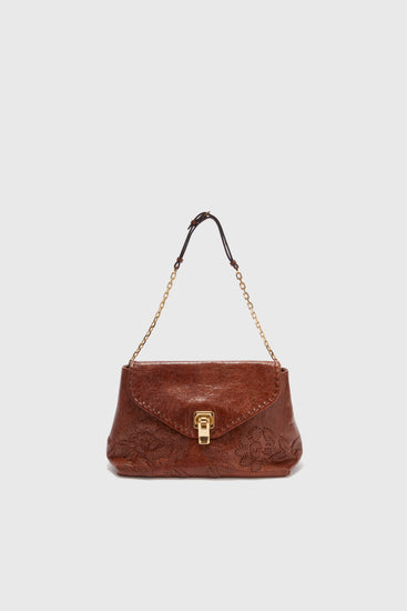 Présenté pour la première fois dans la collection, Joy est le nouveau sac d'Ermanno Scervino, alliant raffinement formel et douceur de la matière dans un équilibre parfait. Son design à rabat et anse chaîne lui confère une élégance contemporaine, idéale pour un porté main ou épaule. Réalisé en nappa marron à l'effet froissé et soyeux, il est orné d'une broderie florale réalisée à la main avec des rubans de cuir ton sur ton, véritable signe distinctif du savoir-faire artisanal. Les pieds en demi-sphère avec logo gravé et la nouvelle fermeture à clip complètent ce modèle de détails exclusifs et fonctionnels. Une nouvelle icône de style, conçue pour accompagner chaque instant avec raffinement.