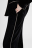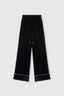 L’élégance décontractée de l’esprit boudoir devient tenue de défilé. Ce pantalon palazzo en velours de viscose et soie réinvente les codes du pyjama classique avec toute la sophistication signée Ermanno Scervino. Le passepoil blanc contrastant souligne les ourlets et les côtés, évoquant une élégance nocturne revisitée en clé urbaine et féminine.