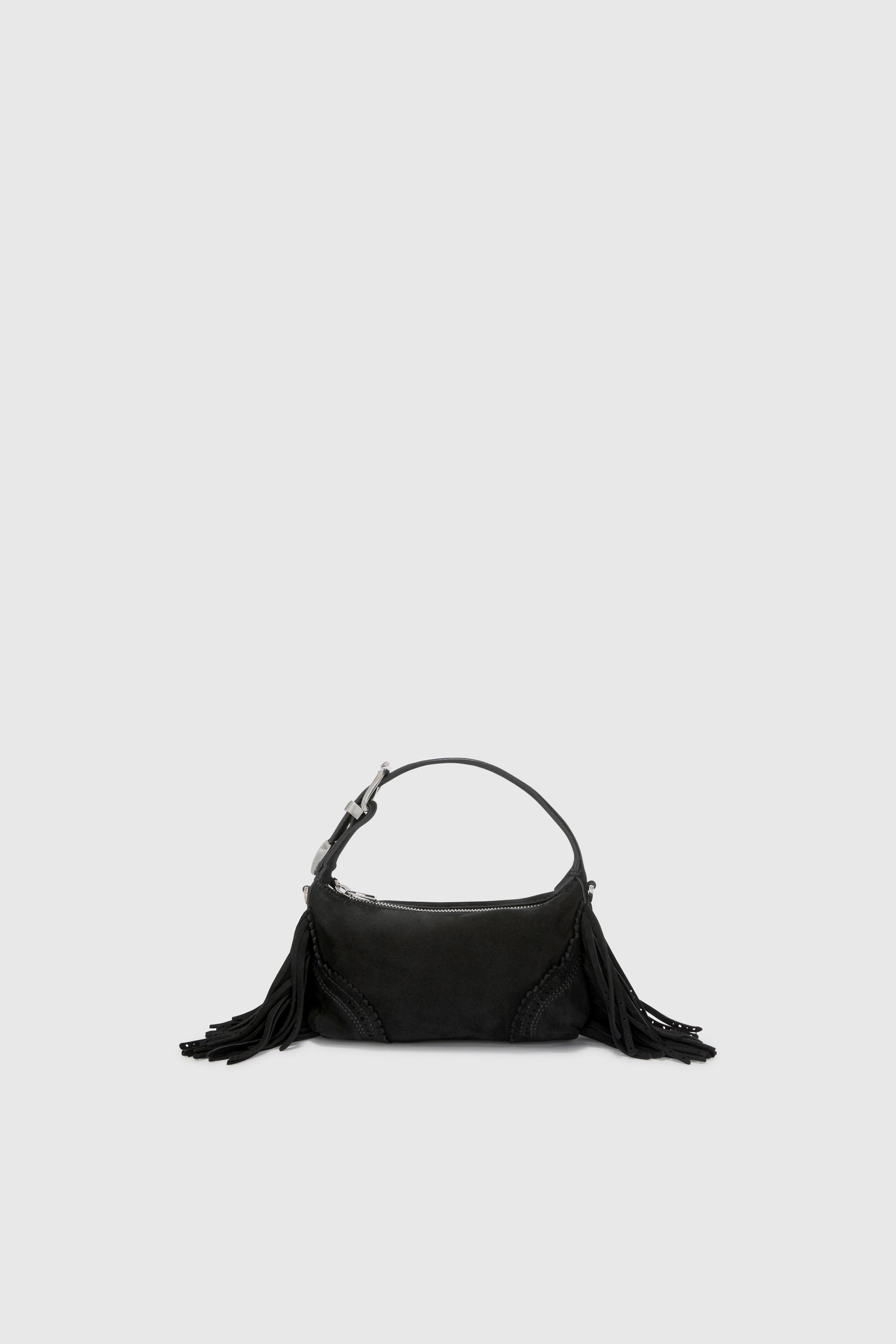 The Candy in black suede is a shoulder bag with a refined, understated charm. The soft, lightweight suede provides elegance and comfort, while the zip closure and adjustable handle with bespoke buckle ensure practicality and security. Fringes on the sides and perforated corners echo the collection’s signature motif, adding dynamism and character to this versatile accessory. Perfect for chic, everyday contemporary looks.