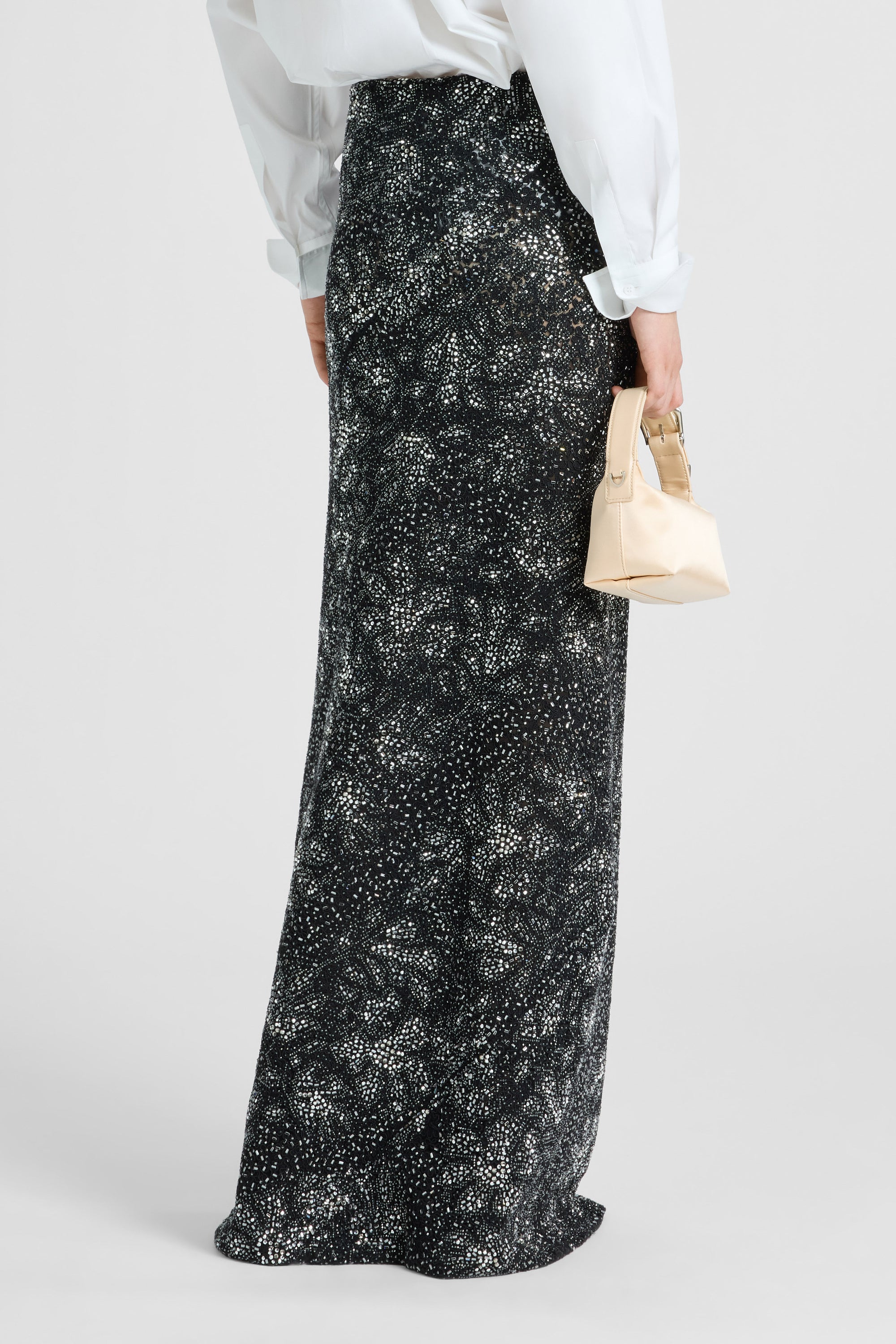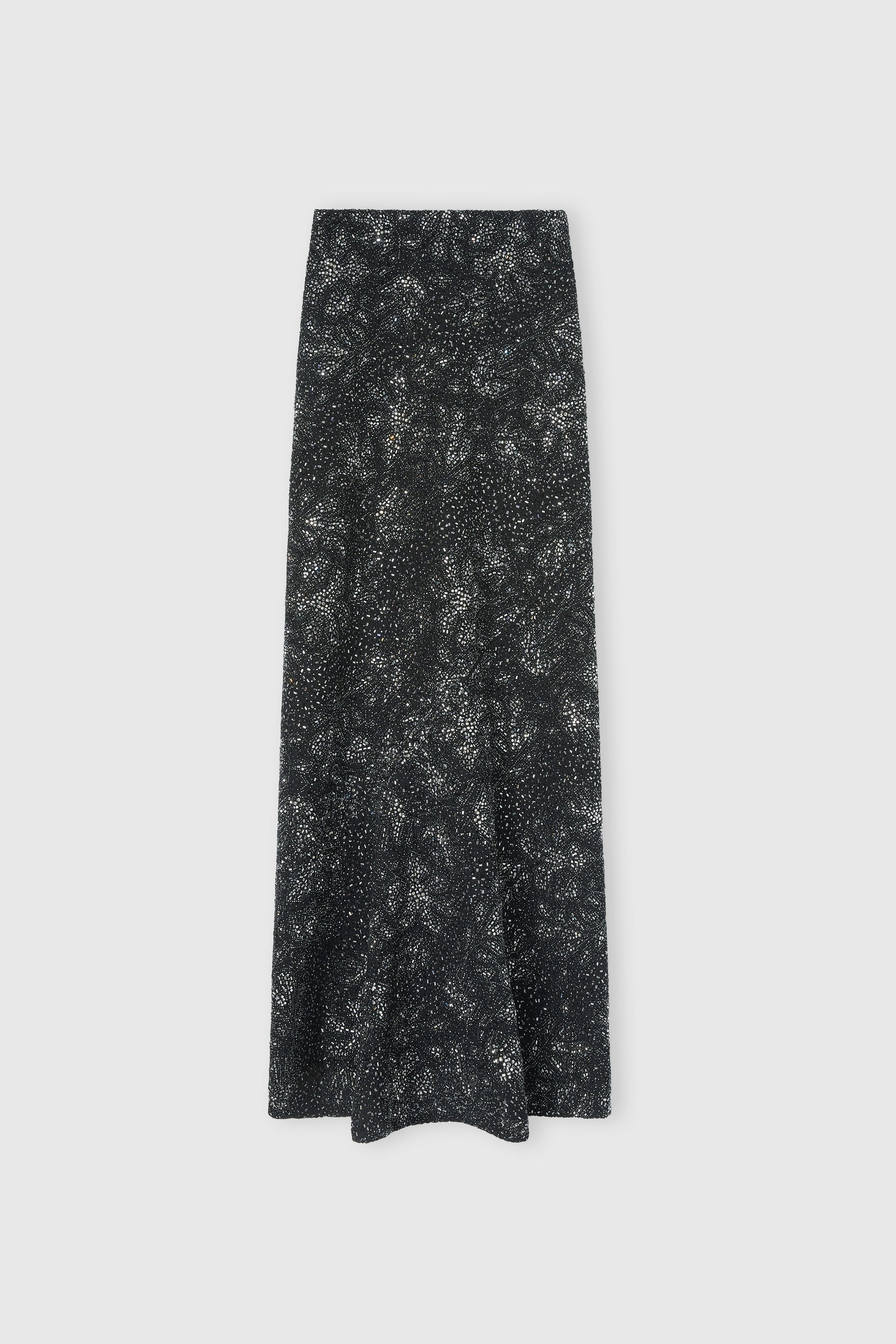 A long skirt with sophisticated and contemporary charm, designed to enhance femininity with elegance. The side concealed zip ensures a clean and discreet fit. The piece is enriched with hand-applied stones and crystals, recreating a delicate floral and rose lace-inspired motif, with black and silver tones that add movement and depth to the design. Perfect to pair with minimalist tops or lightweight blouses for refined evening looks with high impact.