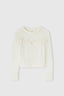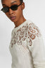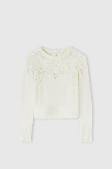 Le vêtement est orné d'une incrustation de dentelle rebrodée en laine, réalisée à la main, qui se développe avec une élégance discrète sur le haut du buste, devant et derrière. Le motif floral de la dentelle, exclusif à la maison Ermanno Scervino, apporte une touche romantique et raffinée, sublimant la linéarité du pull par un délicat jeu de textures. Le design est complété par deux empiècements latéraux micro-perforés, positionnés sur les côtés, qui confèrent légèreté et mouvement à la silhouette grâce à une transparence raffinée.