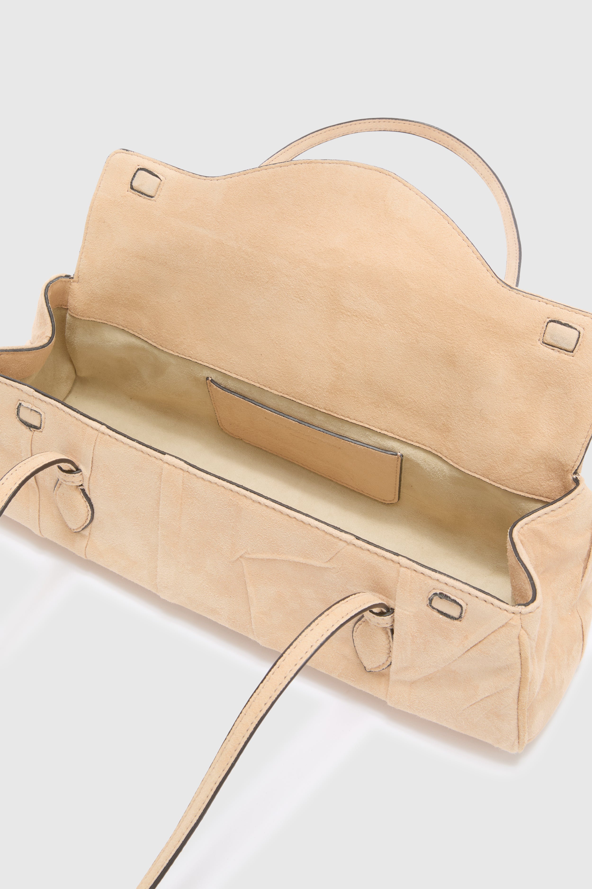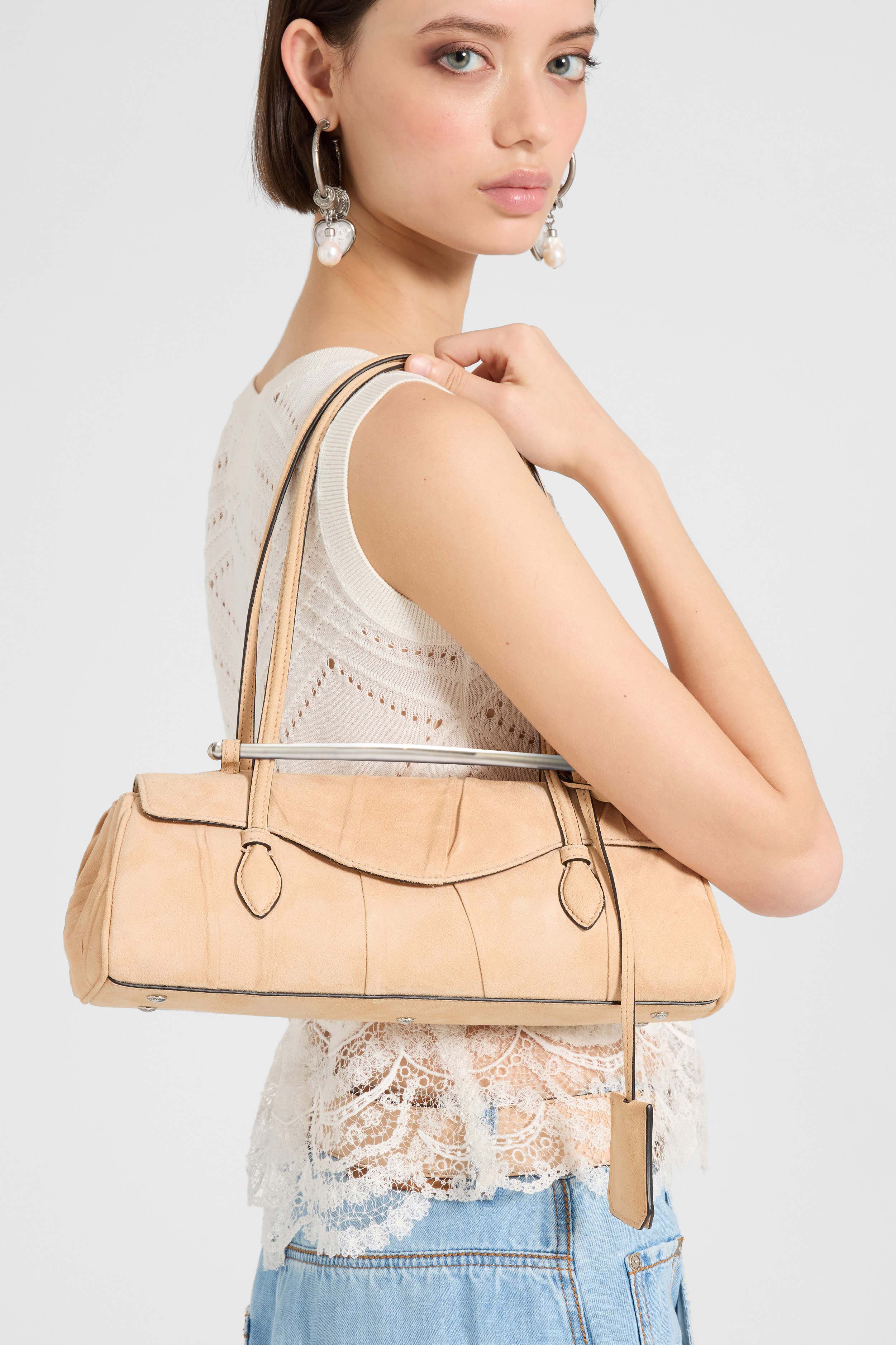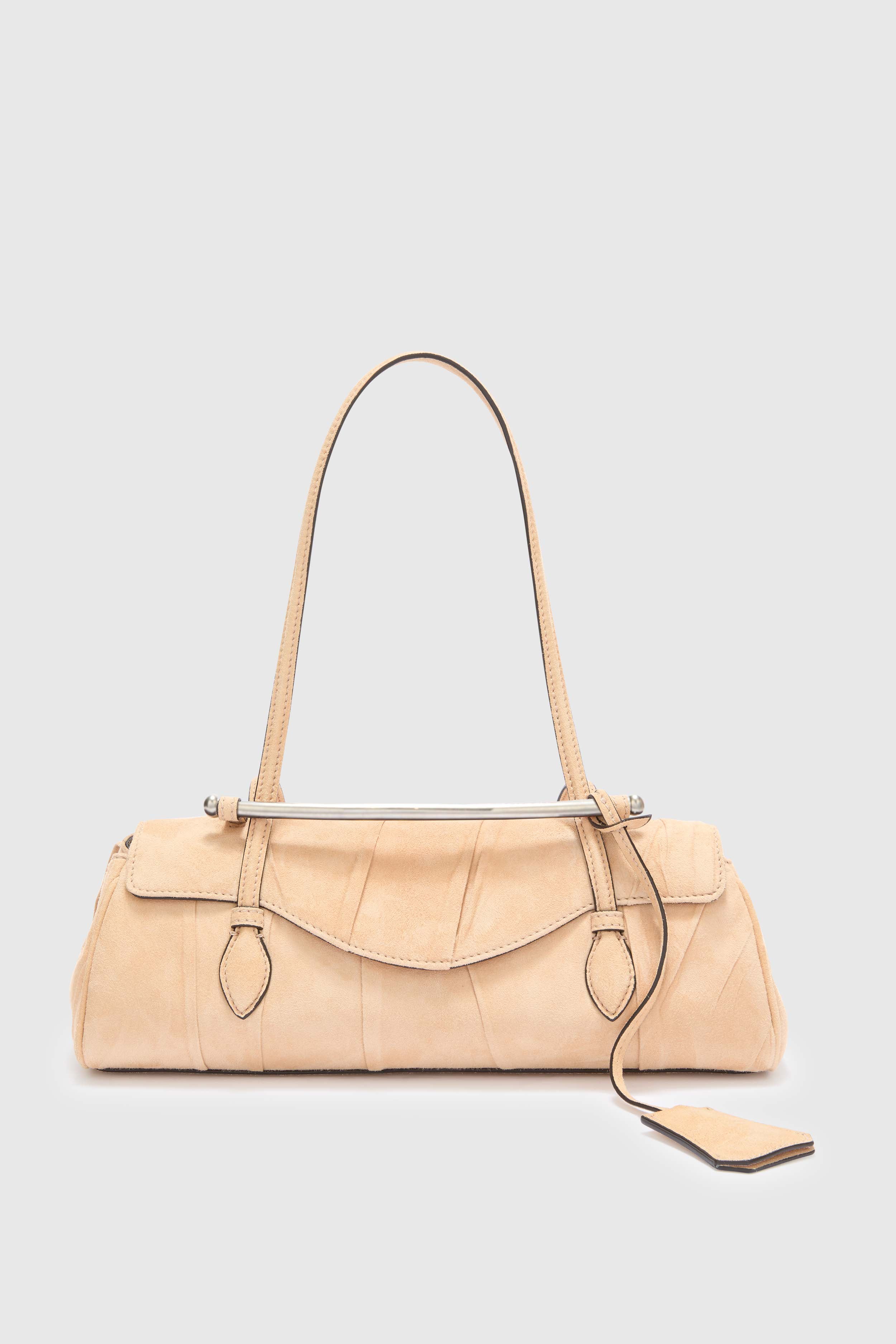 Elegante e iconica, la Mini Music si presenta per la prima volta in versione mini, conservando i dettagli distintivi della versione più grande. La borsa prende il nome “Music” ispirandosi alle borse portaspartiti vintage, reinterpretate in chiave contemporanea. Il corpo in camoscio plissettato a mano rende ogni pezzo unico, conferendo movimento e texture alla silhouette compatta.