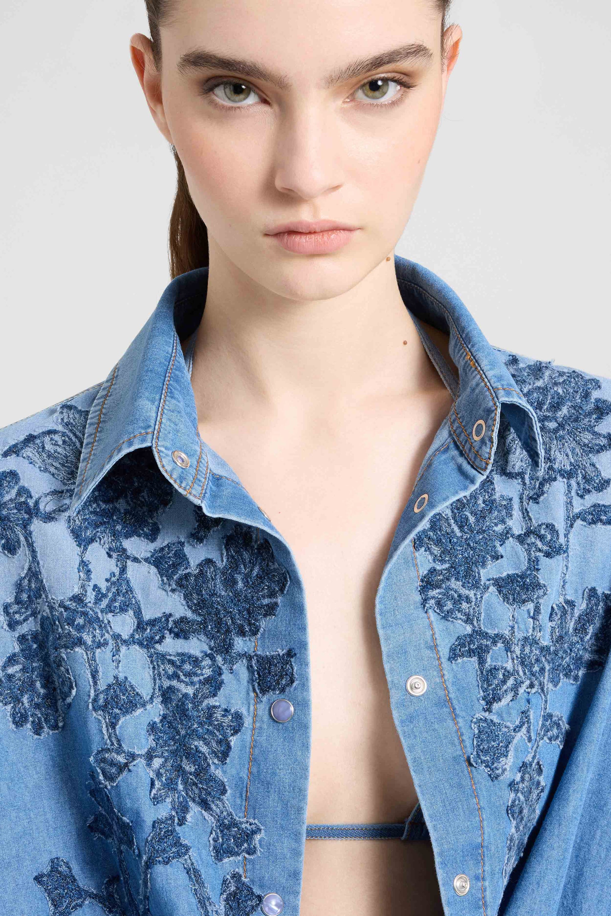 Camicia in denim di cotone con ricamo floreale