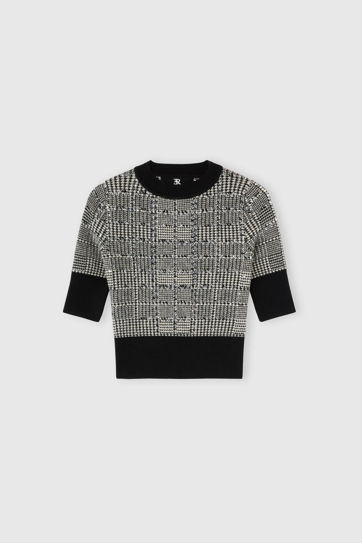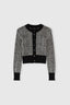 Cardigan corto jacquard in lana con motivo pied de poule e cristalli