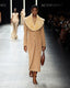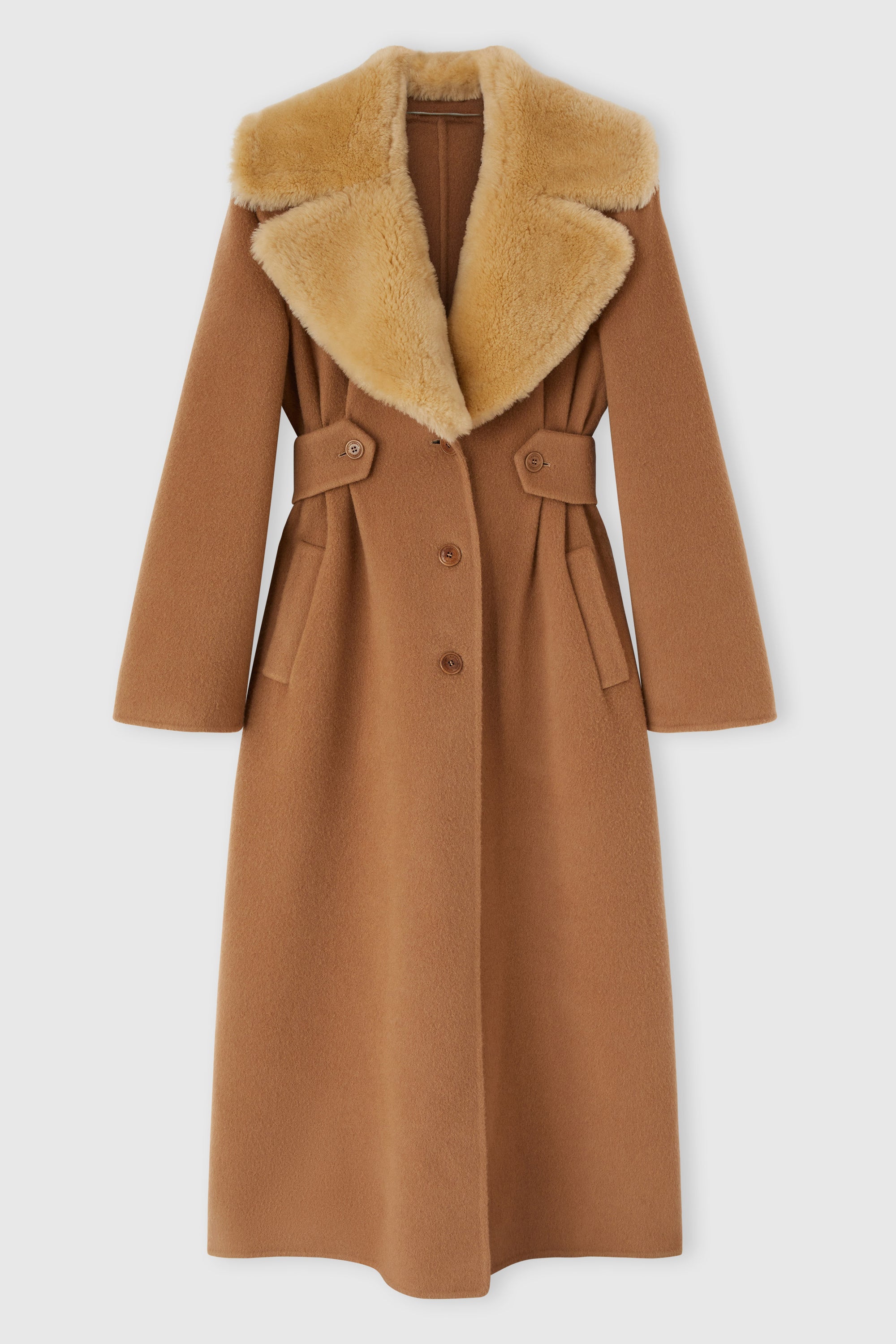 L’ampio rever, protagonista del capo, è impreziosito da una soffice pelliccia di alpaca, che ne enfatizza la volumetria e regala un dettaglio ricercato e avvolgente. Dietro, la martingala aggiunge un tocco sartoriale, sottolineando la costruzione impeccabile del cappotto.