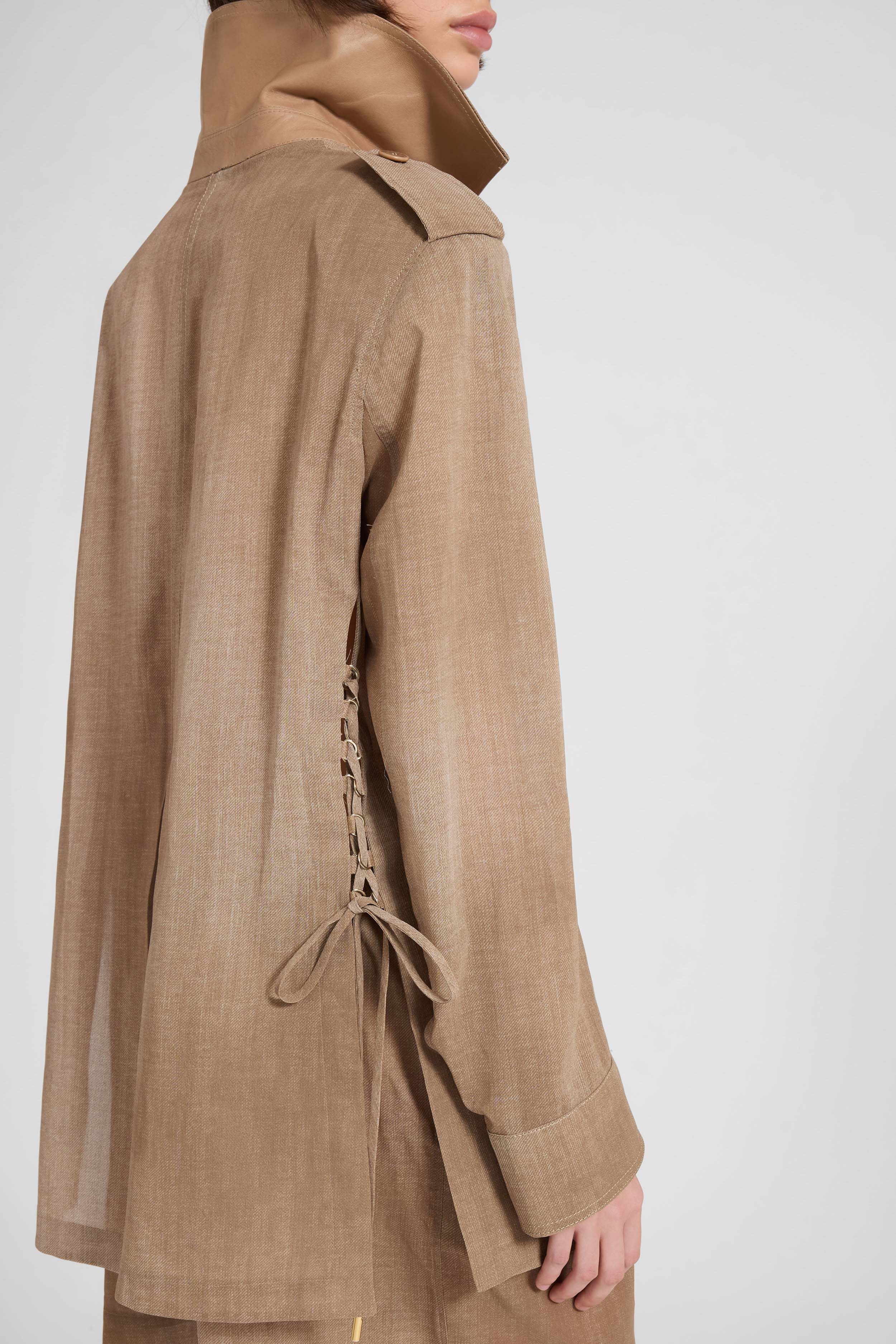 Sahariana in georgette tecnica con chiffon di seta e cintura in nappa