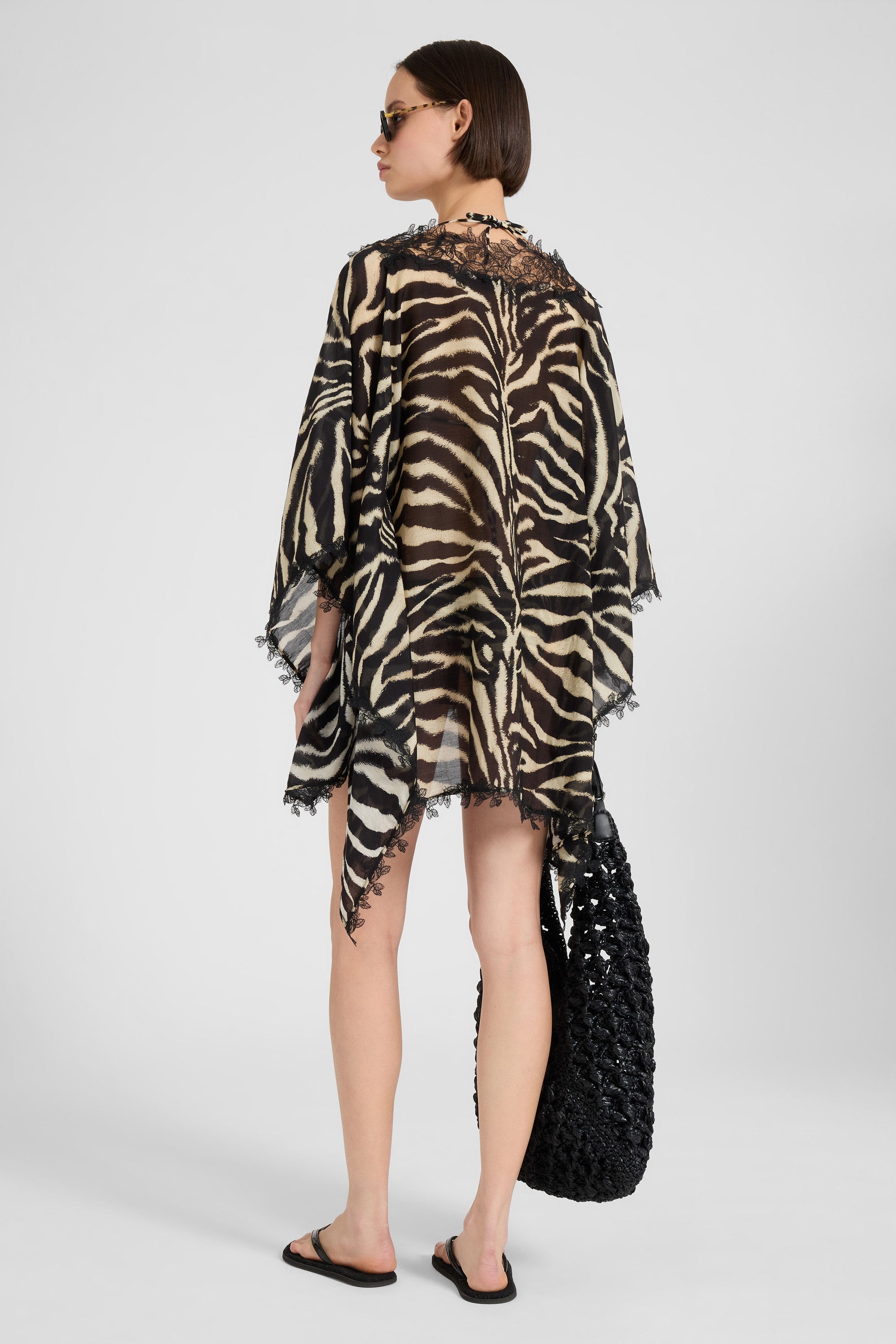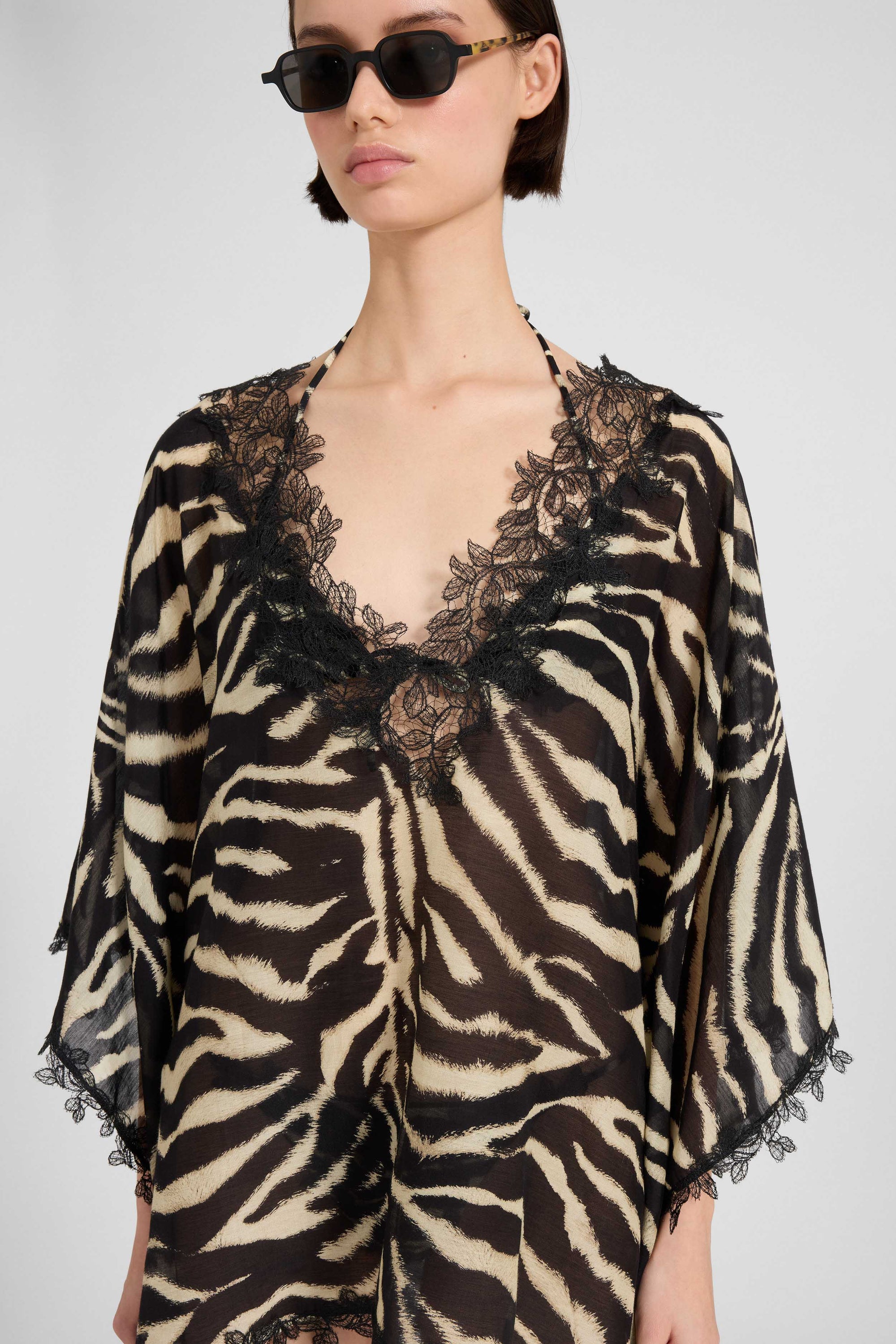 Il dettaglio del pizzo prosegue lungo il bordo inferiore del capo e lungo il fondo delle maniche a kimono, aggiungendo ritmo e armonia al movimento del kaftano. La combinazione tra la leggerezza del tessuto e il motivo animalier rende il capo versatile, perfetto sia come fuori acqua raffinato sia abbinato a shorts o pantaloni per un look beachwear contemporaneo.