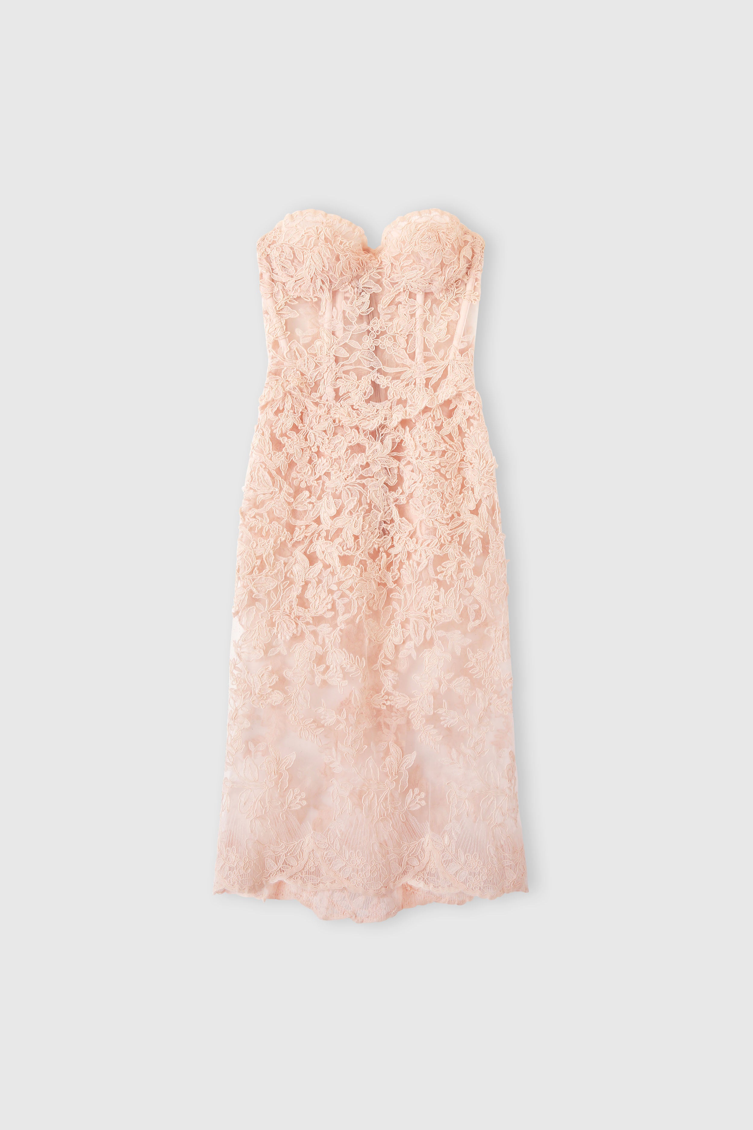 Abito bustier stripeless in pizzo rebrodè piazzato a mano su tulle