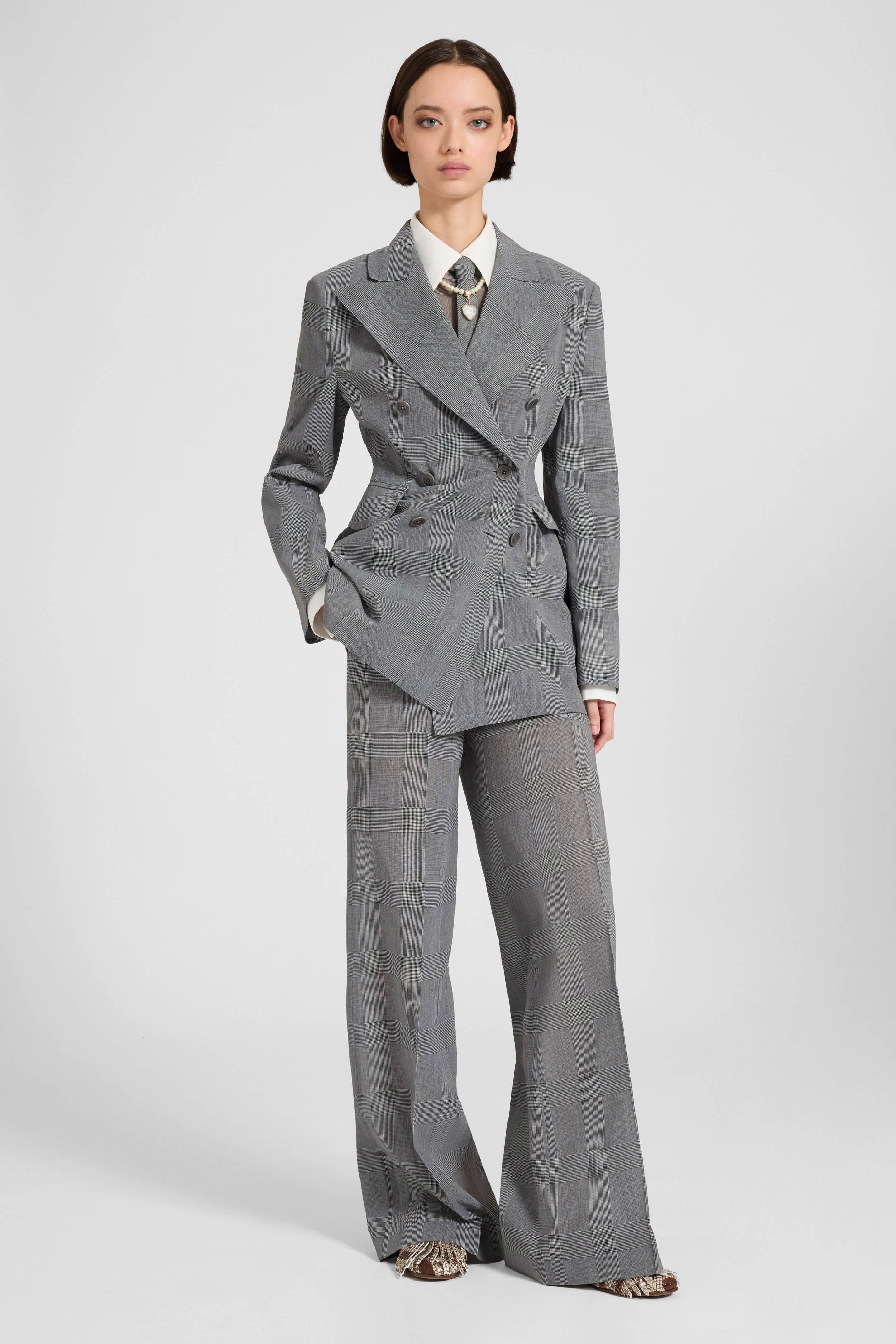 Look da sfilata abbinato a giacca doppiopetto e camicia coordinata
