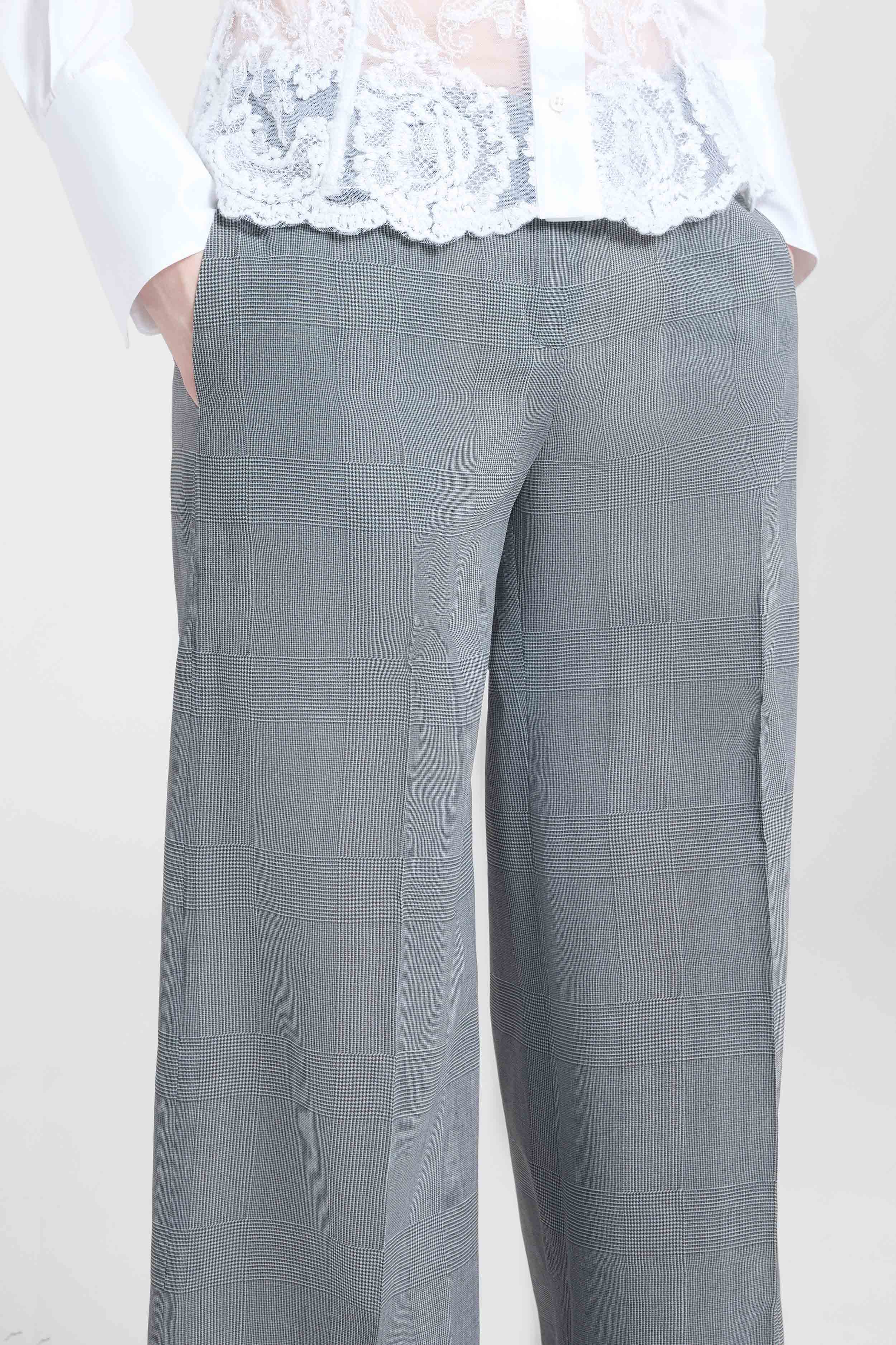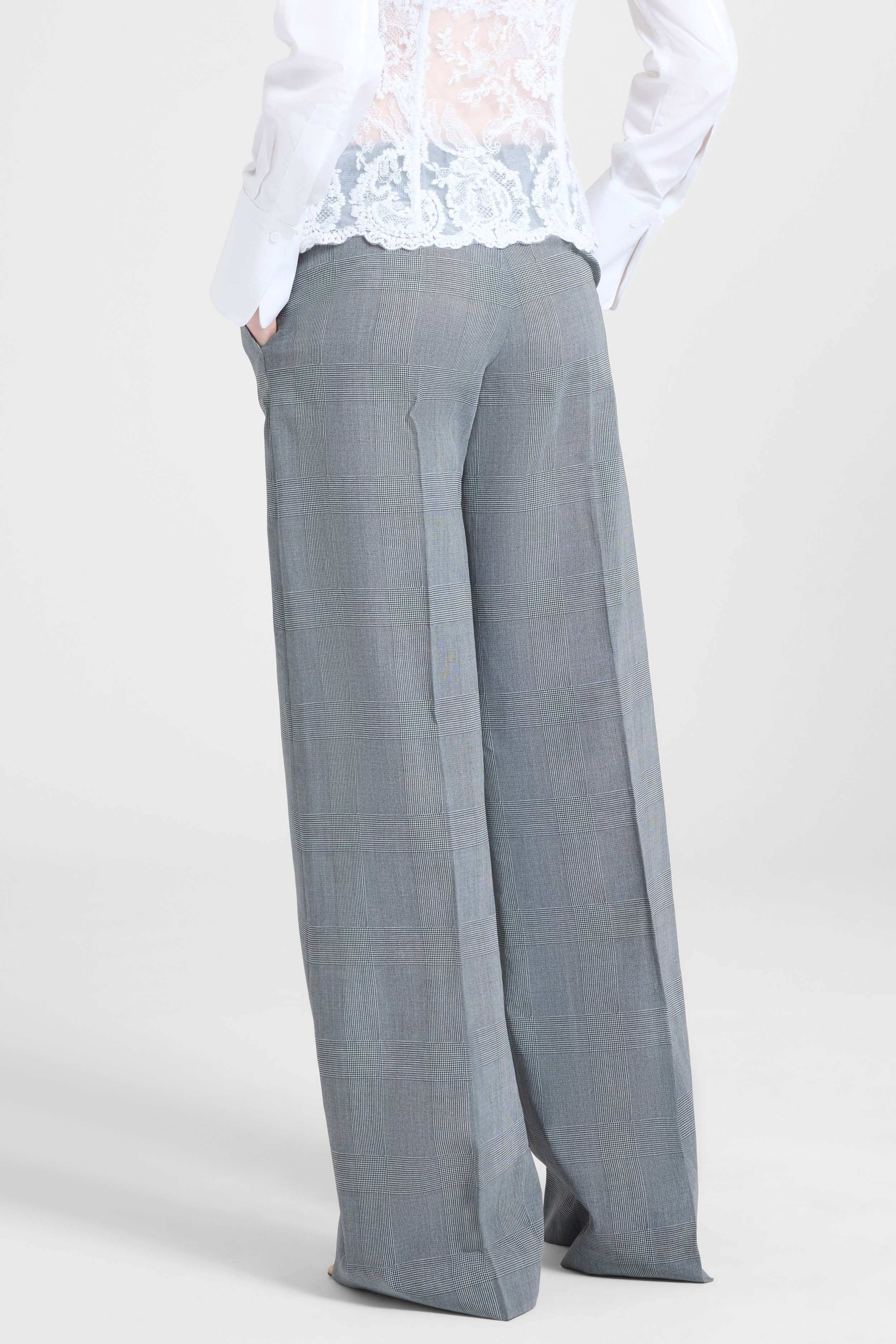 L’esterno presenta una stampa galles elegante, mentre l’interno rivela un micro pied de poule, creando un contrasto sofisticato e discreto. La linea palazzo slanciata valorizza la silhouette, conferendo movimento e leggerezza a chi lo indossa, pur mantenendo una struttura sartoriale impeccabile.
