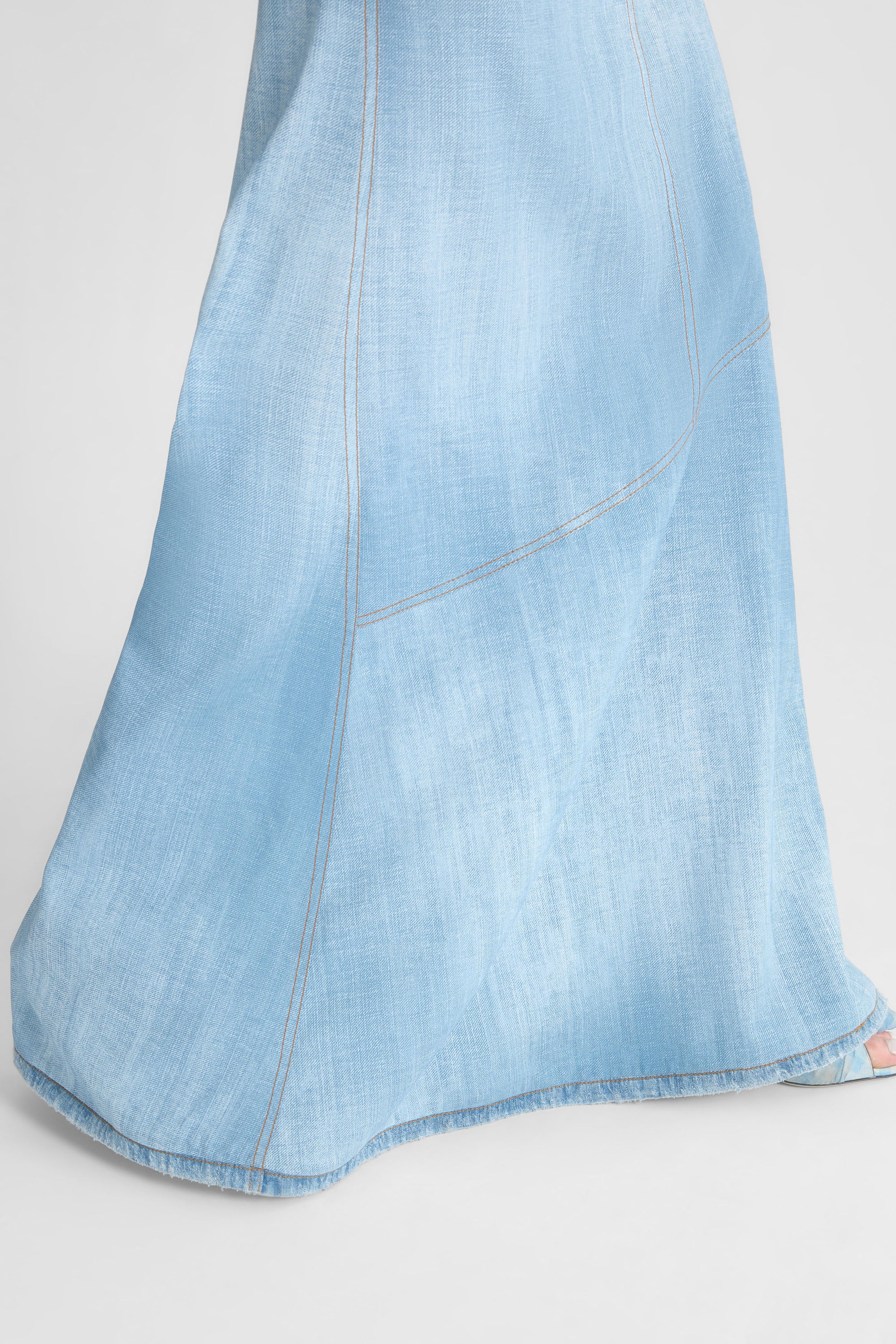 A long skirt with contemporary charm and casual-chic character, crafted in our iconic marocain fabric with jeans print. The piece echoes the style of classic denim skirts with contrast topstitching defining the waistband, pockets, button placket, and front zip. A diagonal seam runs from the hip down the length of the skirt, elongating the figure and enhancing the silhouette. At the back, classic jean-style pockets and a leather patch with the logo on the waistband complete the design with a distinctive and refined touch. Perfect to pair with lightweight shirts or knitwear for modern, versatile looks.