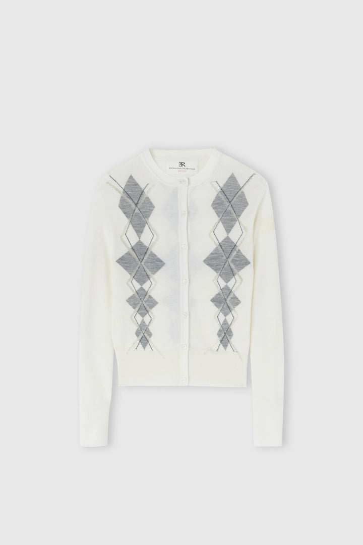At the center of the design, the argyle weave is enriched with hand-applied baguette crystals in tone, which follow the central axis of the diamonds and give the garment a calibrated brightness, elegant but never excessive. The pure merino wool yarn guarantees thermal comfort and a soft hand, while the halter cut sculpts the upper part of the bust with delicate sensuality.
