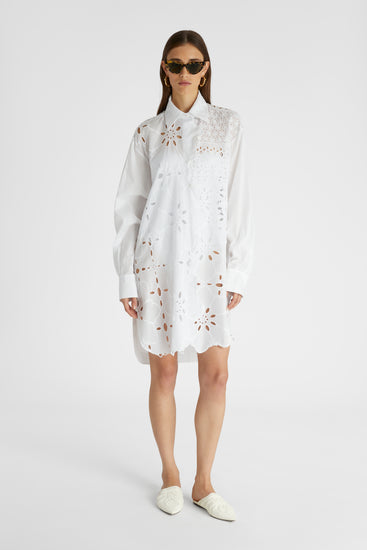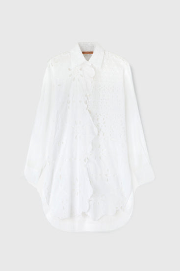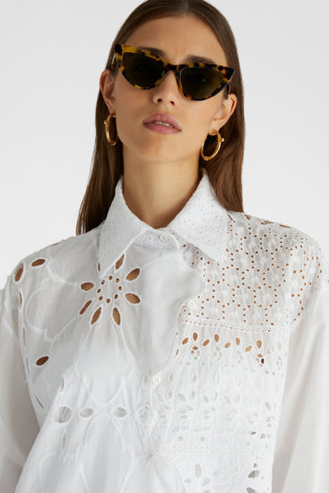 Oversized pure cotton muslin shirt with broderie anglaise embroidery on the front and back of the sleeve.