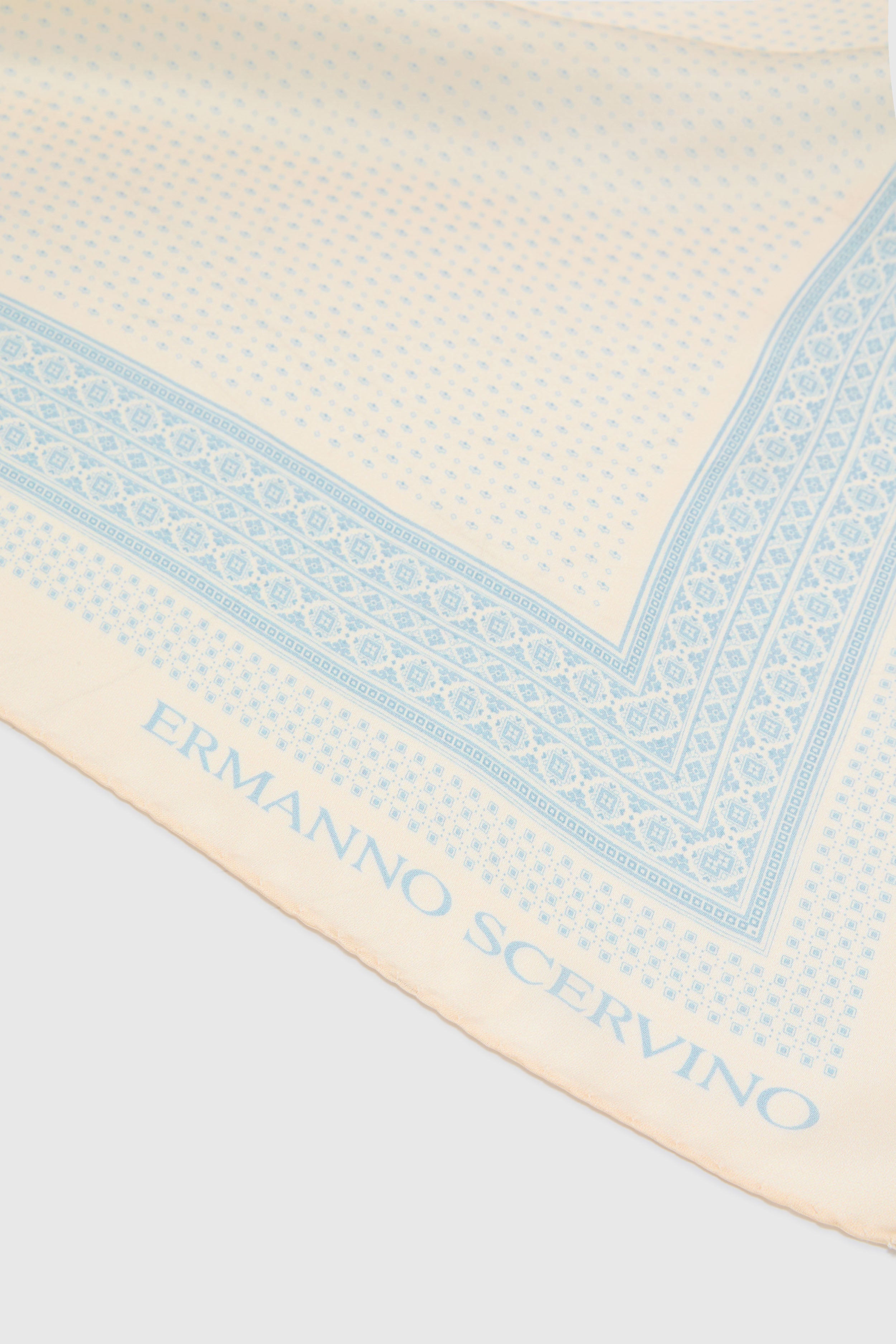 An iconic accessory reinterpreted with contemporary elegance. This square scarf in pure silk features a bandana print in delicate shades of blue and cream, creating a luminous and refined palette that evokes lightness and femininity.