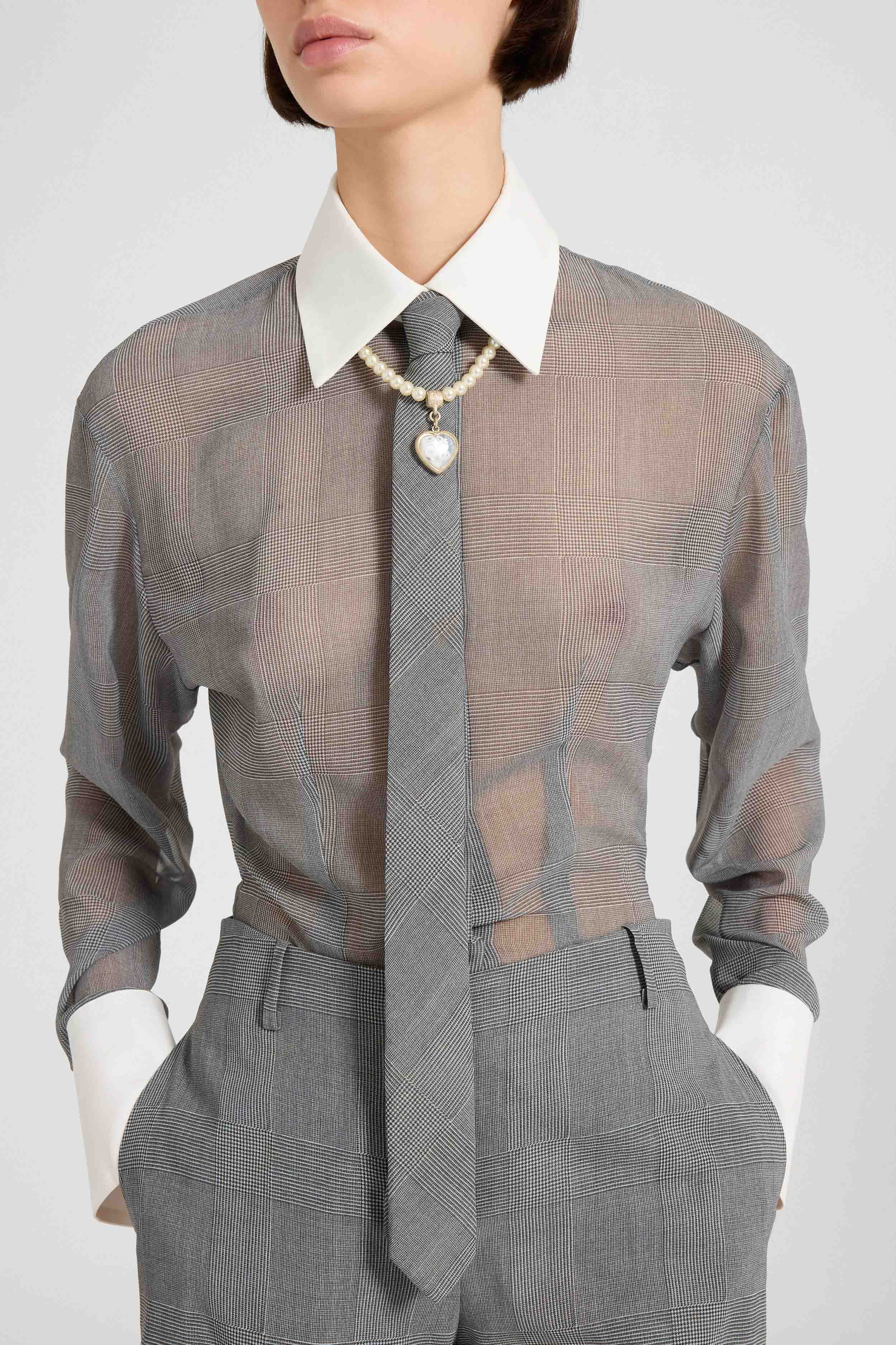 An iconic accessory that completes one of the most memorable looks from the SS26 runway: this tie with classic black and white Prince of Wales print defines any suit with refined precision. Perfectly paired with the technical georgette suit in the same print, it enhances the styling with a contemporary, sartorial touch, turning even the smallest detail into a true style statement.